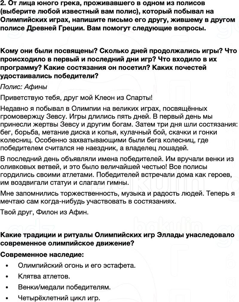 2. От лица юного грека, проживавшего в одном из полисов (выберите любой известный вам полис), который побывал на Олимпийских играх, напишите письмо его другу, жившему в другом полисе Древней Греции.