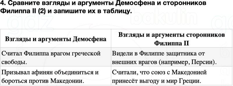 4. Сравните взгляды и аргументы Демосфена и сторонников Филиппа II (2) и запишите их в таблицу.