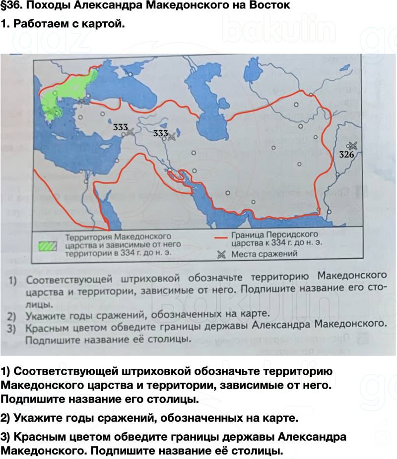 1) Соответствующей штриховкой обозначьте территорию Македонского царства и территории, зависимые от него. Подпишите название его столицы.