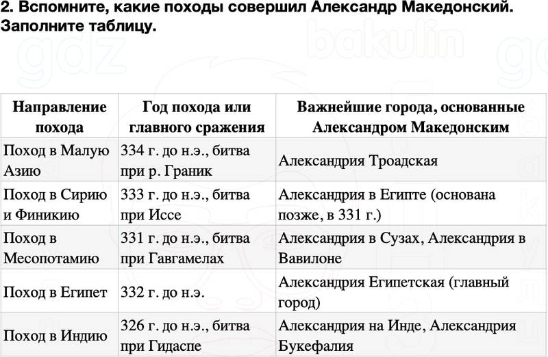 2. Вспомните, какие походы совершил Александр Македонский. Заполните таблицу.