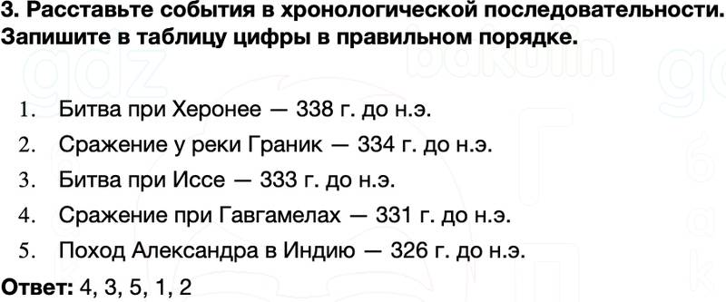 Правильный ответ к заданию из ГДЗ История древнего мира Рабочая тетрадь 5 класс Саплина, Соломатина §36. Походы Александра Македонского на Восток, номер 3