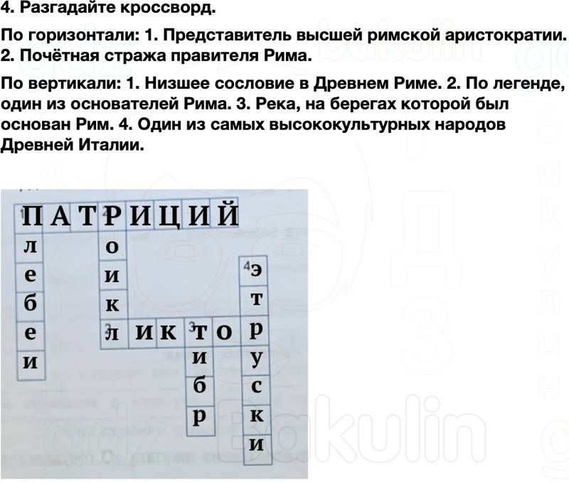 По вертикали: 1. Низшее сословие в Древнем Риме. 2. По легенде, один из основателей Рима. 3. Река, на берегах которой был основан Рим. 4. Один из самых высококультурных народов Древней Италии.