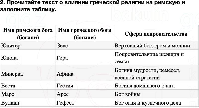 2, Прочитайте текст о влиянии греческой религии на римскую и заполните таблицу.