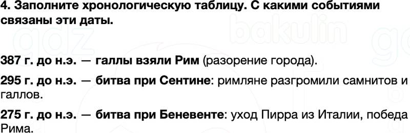 Правильный ответ к заданию из ГДЗ История древнего мира Рабочая тетрадь 5 класс Саплина, Соломатина §42. Завоевание Римом Италии, номер 4