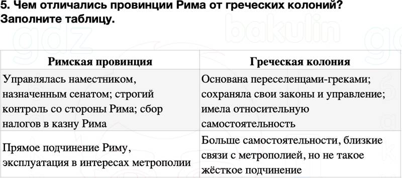 5. Чем отличались провинции Рима от греческих колоний? Заполните таблицу.