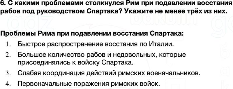 6. С какими проблемами столкнулся Рим при подавлении восстания рабов под руководством Спартака? Укажите не менее трёх из них.