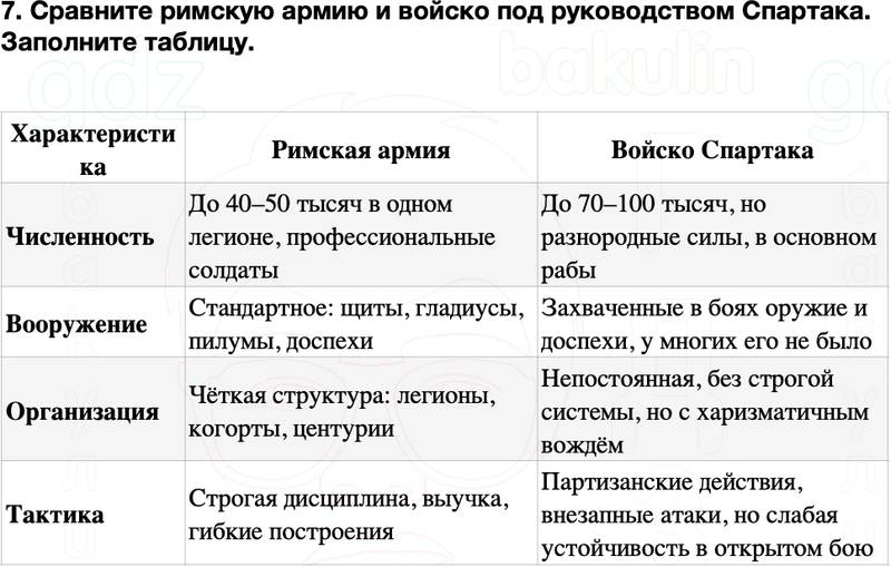 7. Сравните римскую армию и войско под руководством Спартака. Заполните таблицу.
