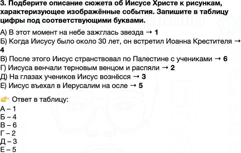 3. Подберите описание сюжета об Иисусе Христе к рисункам, характеризующее изображённые события. Запишите в таблицу цифры под соответствующими буквами.