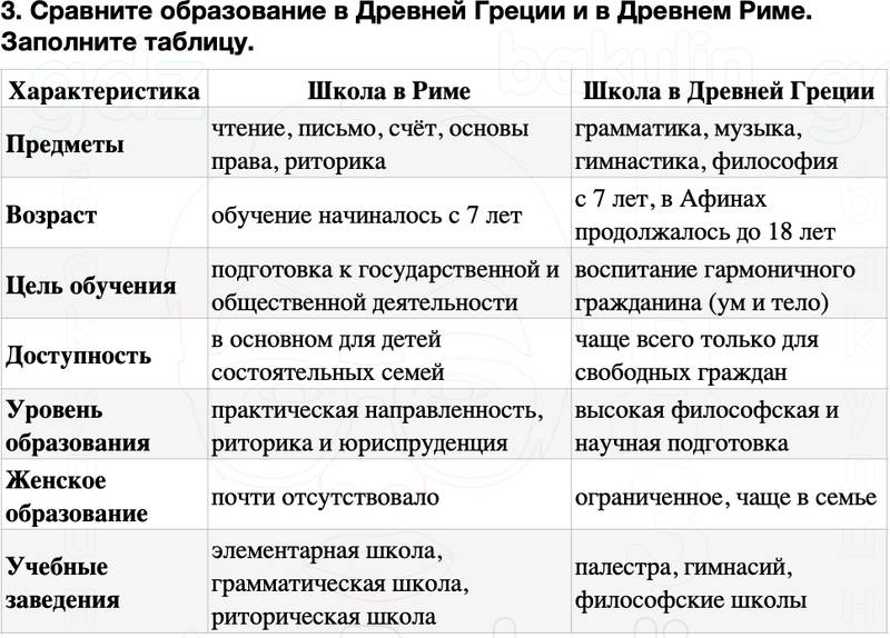 3. Сравните образование в Древней Греции и в Древнем Риме. Заполните таблицу.