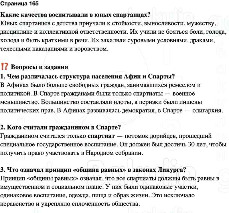 Прочитайте текст и ответьте на вопросы. Философ и писатель Плутарх писал о Спарте: «...Спартанцы считали себя принадлежащими не лично себе, но отечеству».