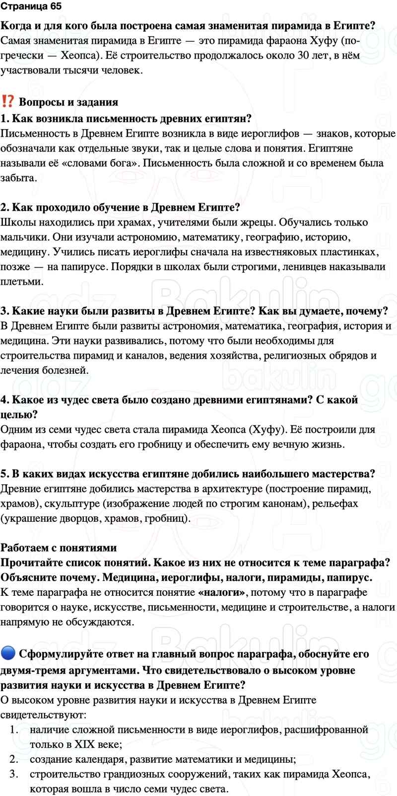 ? Сформулируйте ответ на главный вопрос параграфа, обоснуйте его двумя-тремя аргументами. Что свидетельствовало о высоком уровне развития науки и искусства в Древнем Египте?