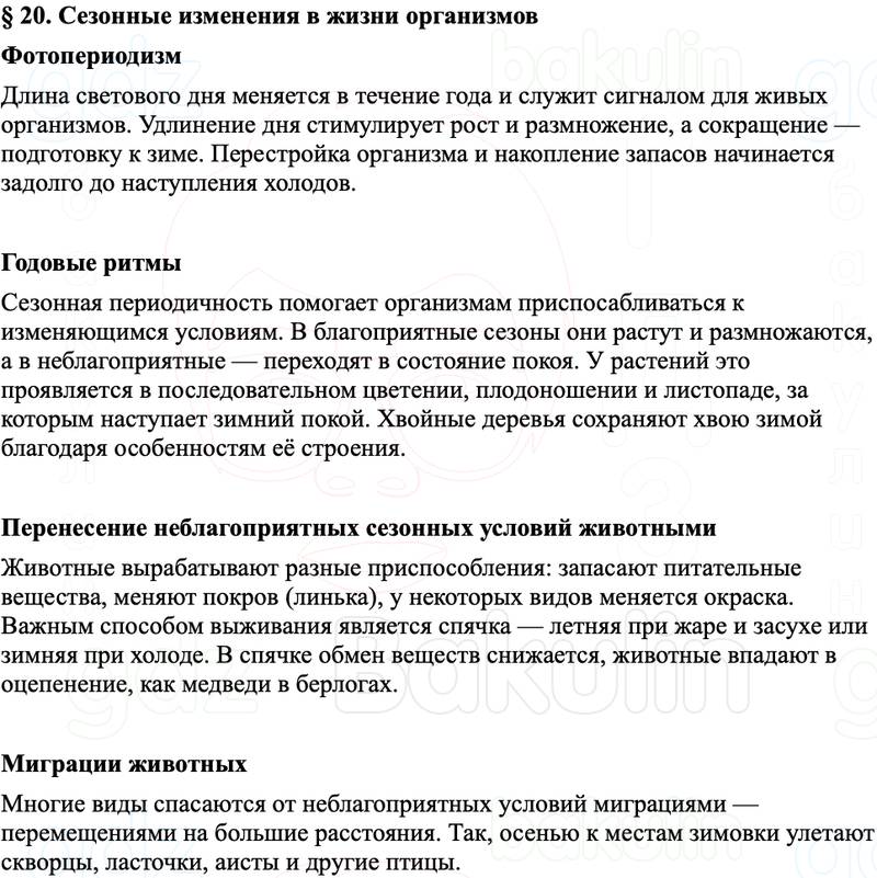 Краткое содержание пересказ Параграф 20. Сезонные изменения в жизни организмов