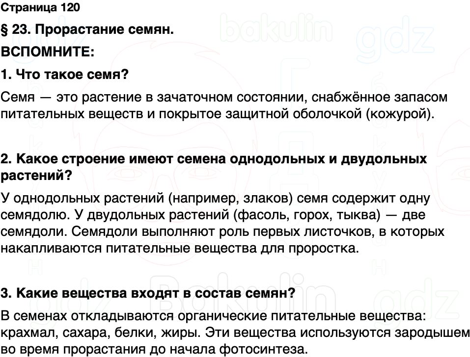 ВСПОМНИТЕ: 1. Что такое семя? 2. Какое строение имеют семена однодольных и двудольных растений? 3. Какие вещества входят в состав семян?