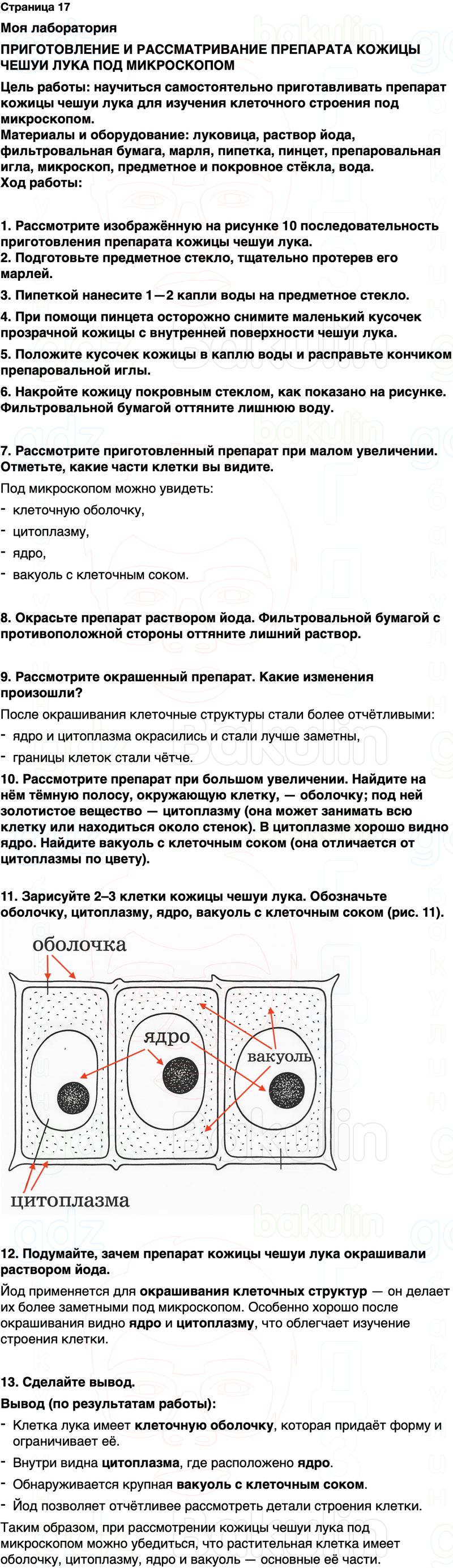 Материалы и оборудование: луковица, раствор йода, фильтровальная бумага, марля, пипетка, пинцет, препаровальная игла, микроскоп, предметное и покровное стёкла, вода.