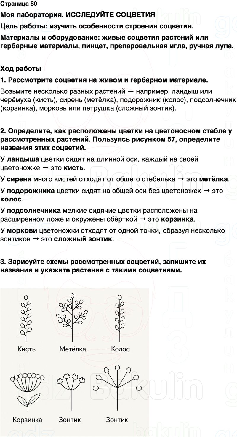 2. Определите, как расположены цветки на цветоносном стебле у рассмотренных растений. Пользуясь рисунком 57, определите названия этих соцветий.