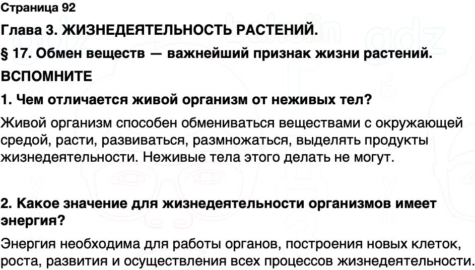 Глава 3. ЖИЗНЕДЕЯТЕЛЬНОСТЬ РАСТЕНИЙ. § 17. Обмен веществ — важнейший признак жизни растений. ВСПОМНИТЕ 1. Чем отличается живой организм от неживых тел? 2. Какое значение для жизнедеятельности организмов имеет энергия?