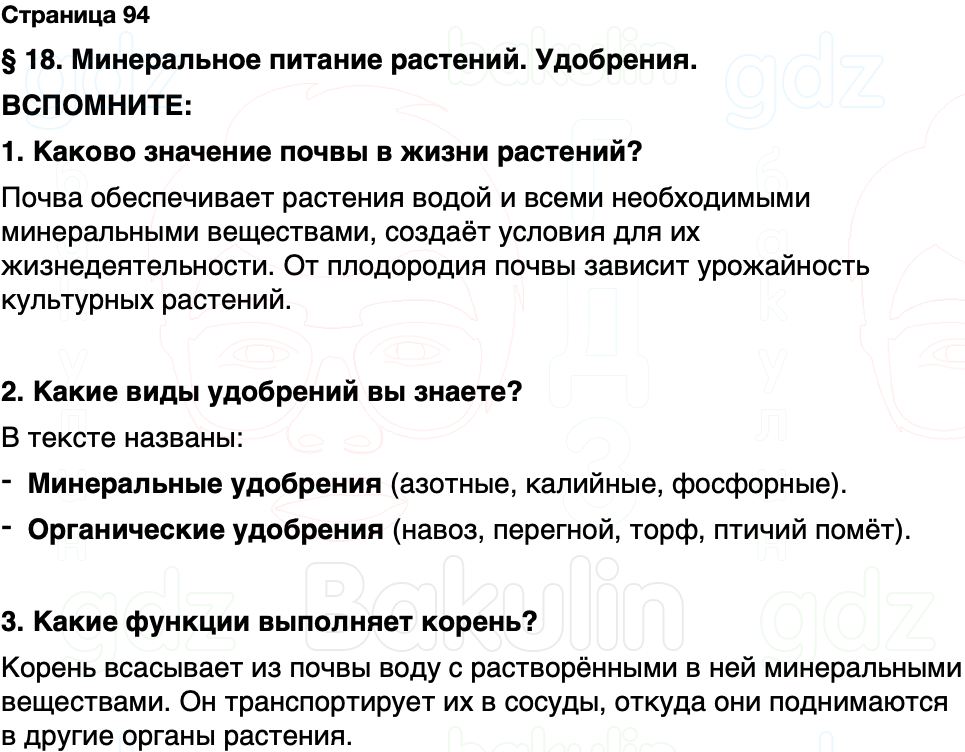 § 18. Минеральное питание растений. Удобрения. ВСПОМНИТЕ: 1. Каково значение почвы в жизни растений? 2. Какие виды удобрений вы знаете? 3. Какие функции выполняет корень?