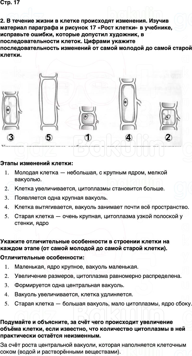 2. В течение жизни в клетке происходят изменения. Изучив материал параграфа и рисунок 17 «Рост клетки» в учебнике, исправьте ошибки, которые допустил художник, в последовательности клеток. Цифрами укажите последовательность изменений от самой молодой до самой старой клетки.
