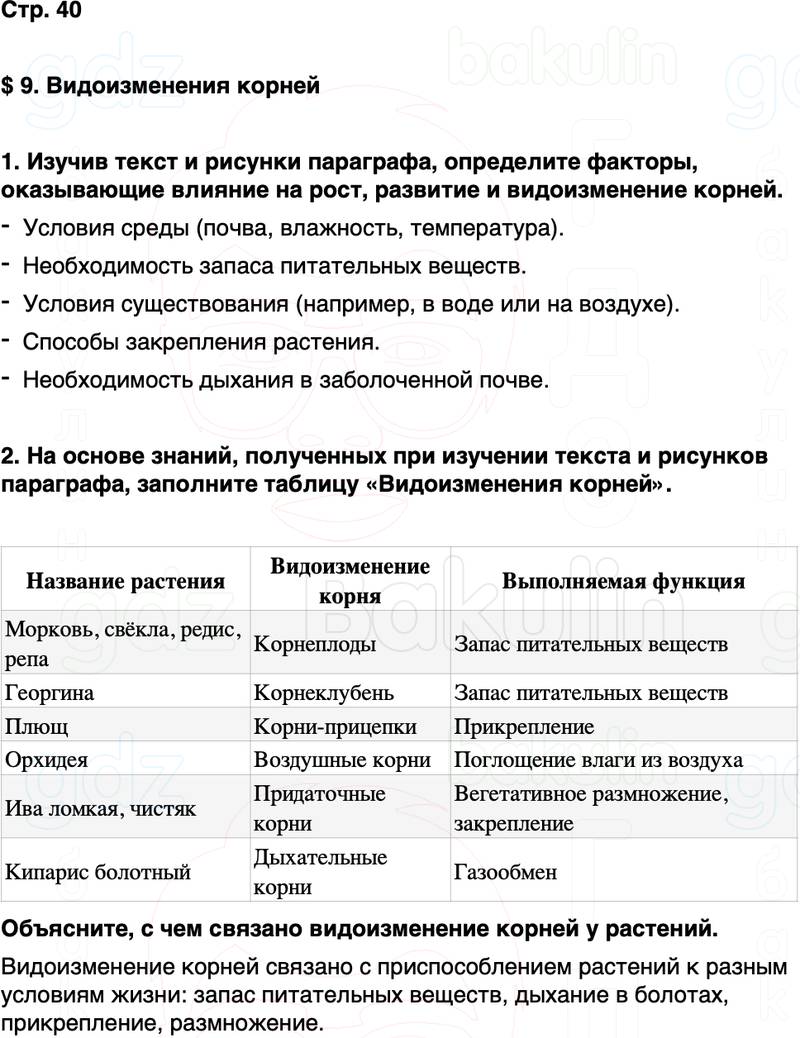 1. Изучив текст и рисунки параграфа, определите факторы, оказывающие влияние на рост, развитие и видоизменение корней.