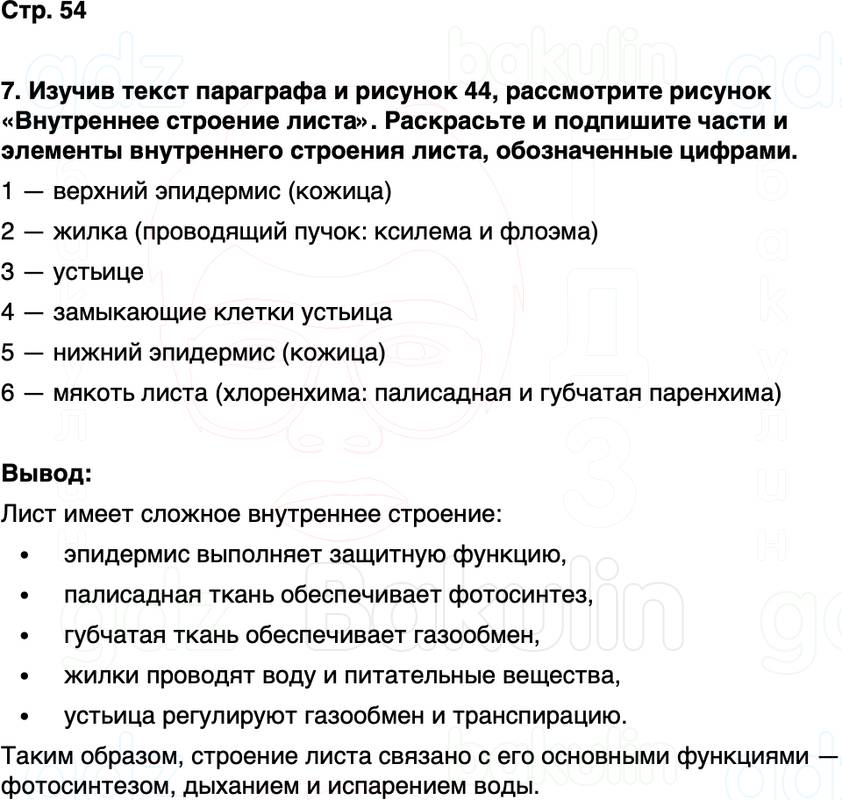 7. Изучив текст параграфа и рисунок 44, рассмотрите рисунок «Внутреннее строение листа». Раскрасьте и подпишите части и элементы внутреннего строения листа, обозначенные цифрами.