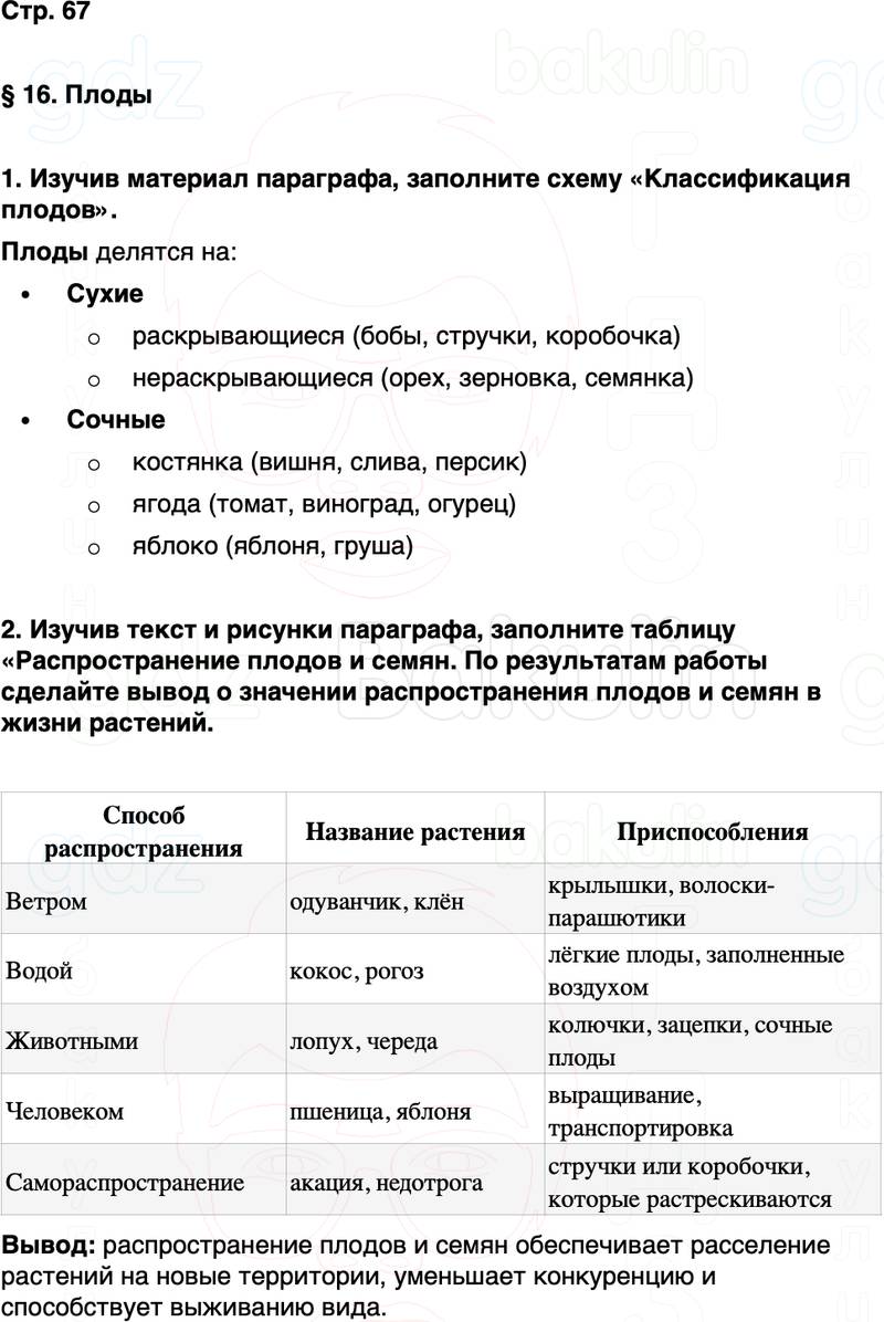 2. Изучив текст и рисунки параграфа, заполните таблицу «Распространение плодов и семяно. По результатам работы сделайте вывод о значении распространения плодов и семян в жизни растений.