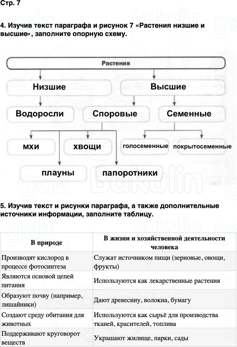 4. Изучив текст параграфа и рисунок 7 «Растения низшие и высшие», заполните опорную схему.