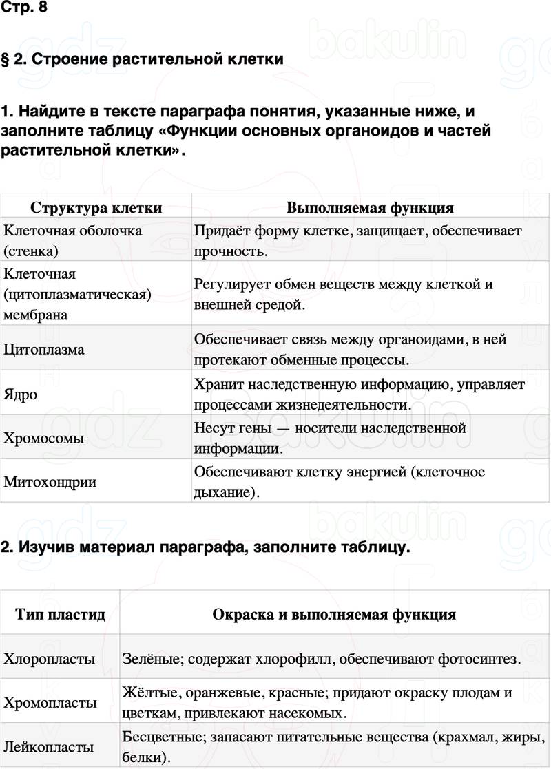 1. Найдите в тексте параграфа понятия, указанные ниже, и заполните таблицу «Функции основных органоидов и частей растительной клетки».