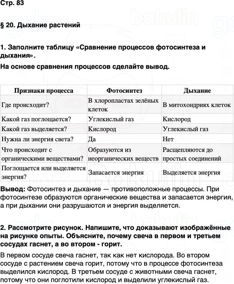 1. Заполните таблицу «Сравнение процессов фотосинтеза и дыхания».