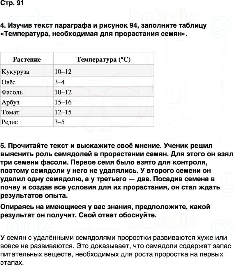 4. Изучив текст параграфа и рисунок 94, заполните таблицу «Температура, необходимая для прорастания семян».