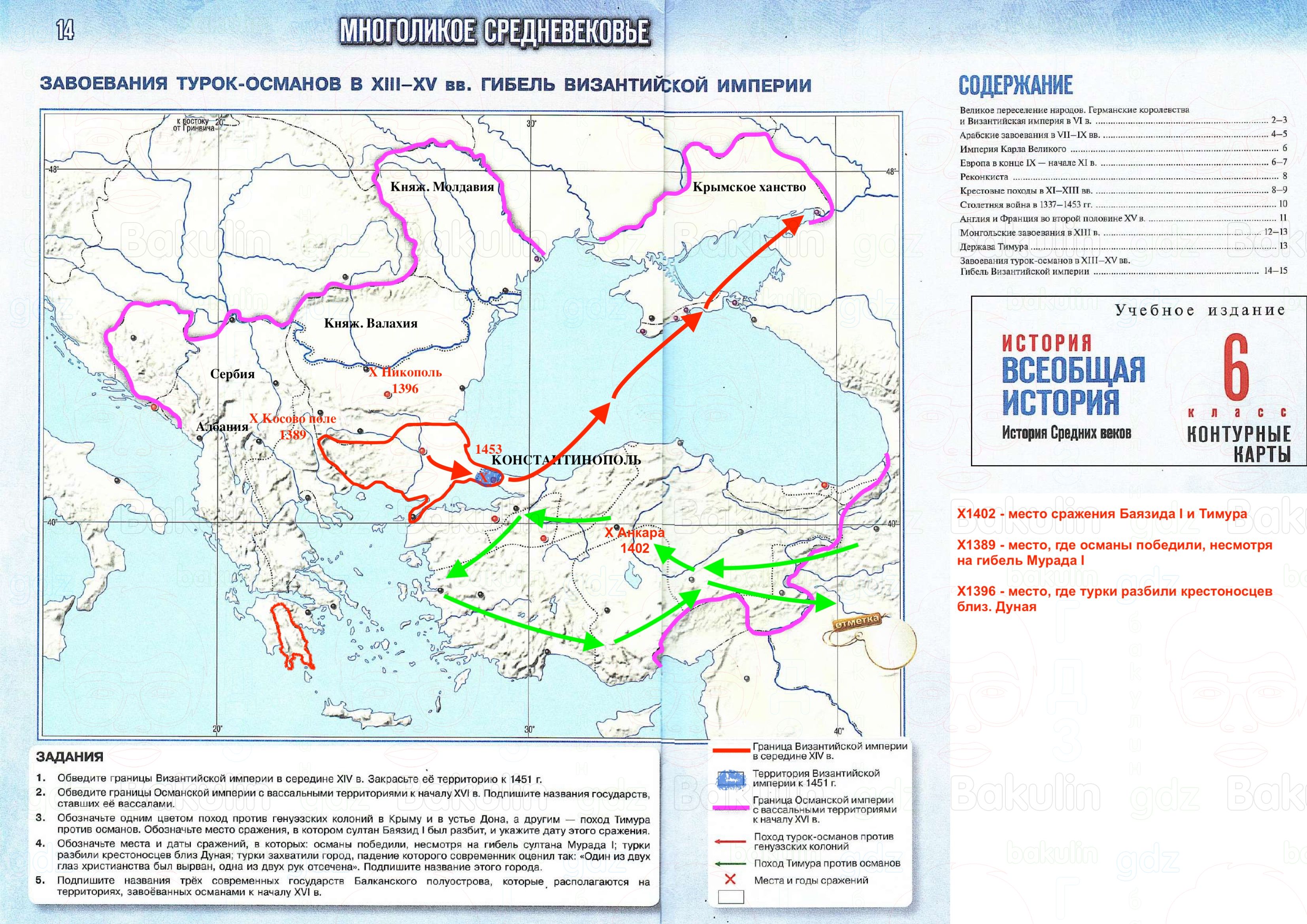 4. Обозначьте места и даты сражений, в которых: османы победили, несмотря на гибель султана Мурада I; турки разбили крестоносцев близ Дуная; турки захватили город, падение которого современник оценил так: «Один из двух глаз христианства был вырван, одна из двух рук отсечена». Подпишите название этого города.