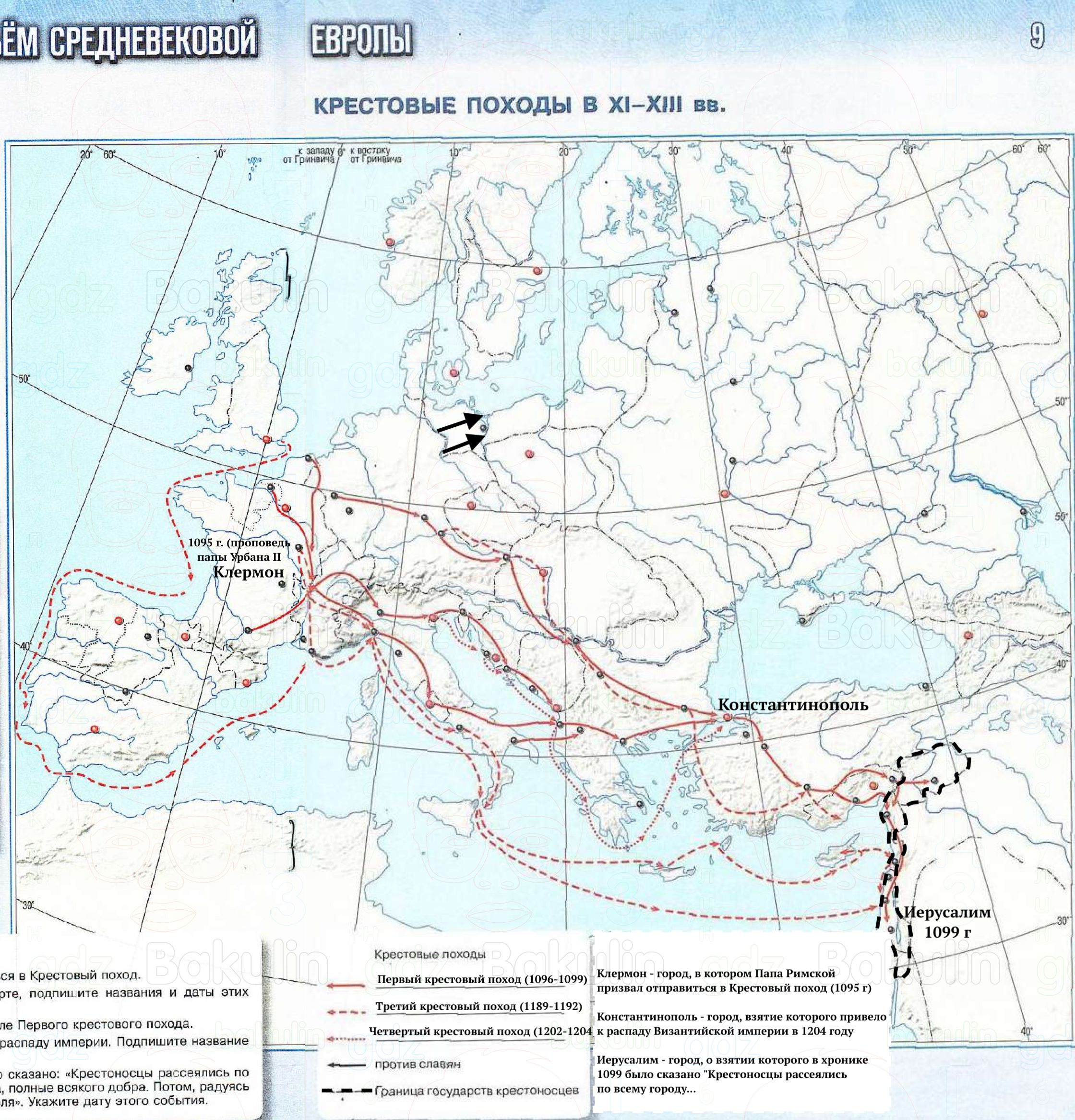 2. Определите, направления каких Крестовых походов обозначены на карте, подпишите названия и даты этих походов в легенде. Обозначьте Крестовый поход против славян.