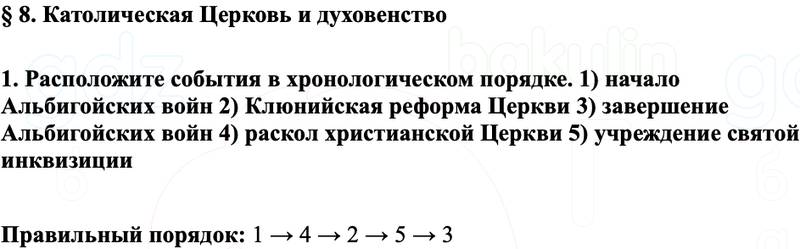 1. Расположите события в хронологическом порядке. 1) начало Альбигойских войн 2) Клюнийская реформа Церкви 3) завершение Альбигойских войн 4) раскол христианской Церкви 5) учреждение святой инквизиции