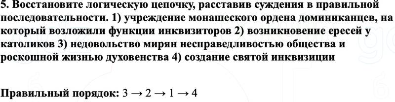 5. Восстановите логическую цепочку, расставив суждения в правильной последовательности. 1) учреждение монашеского ордена доминиканцев, на который возложили функции инквизиторов 2) возникновение ересей у католиков 3) недовольство мирян несправедливостью общества и роскошной жизнью духовенства 4) создание святой инквизиции