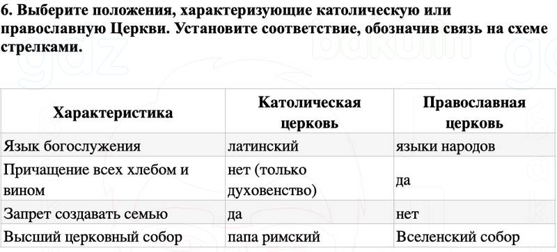 6. Выберите положения, характеризующие католическую или православную Церкви. Установите соответствие, обозначив связь на схеме стрелками.