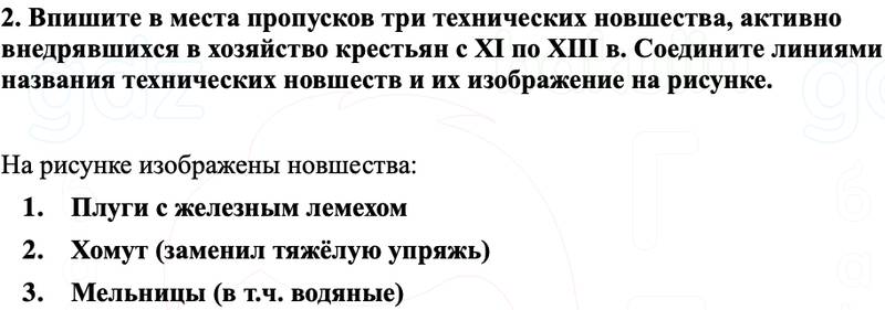 2. Впишите в места пропусков три технических новшества, активно внедрявшихся в хозяйство крестьян с XI по XIII в. Соедините линиями названия технических новшеств и их изображение на рисунке.