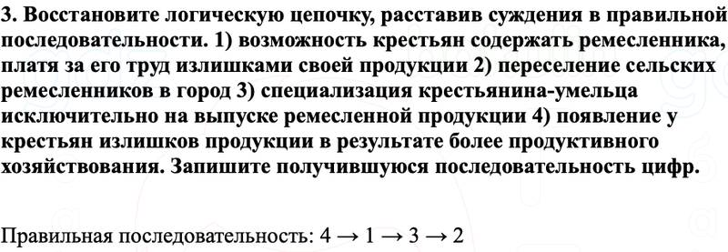 3. Восстановите логическую цепочку, расставив суждения в правильной последовательности. 1) возможность крестьян содержать ремесленника, платя за его труд излишками своей продукции 2) переселение сельских ремесленников в город 3) специализация крестьянина-умельца исключительно на выпуске ремесленной продукции 4) появление у крестьян излишков продукции в результате более продуктивного хозяйствования. Запишите получившуюся последовательность цифр.