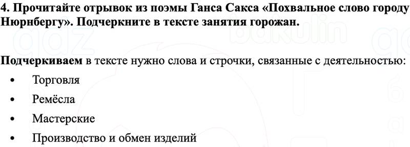 4. Прочитайте отрывок из поэмы Ганса Сакса «Похвальное слово городу Нюрнбергу». Подчеркните в тексте занятия горожан.