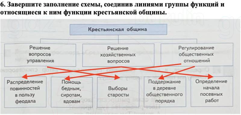 6. Завершите заполнение схемы, соединив линиями группы функций и относящиеся к ним функции крестьянской общины.
