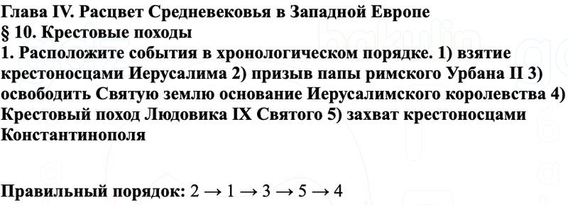 1. Расположите события в хронологическом порядке. 1) взятие крестоносцами Иерусалима 2) призыв папы римского Урбана II 3) освободить Святую землю основание Иерусалимского королевства 4) Крестовый поход Людовика IX Святого 5) захват крестоносцами Константинополя
