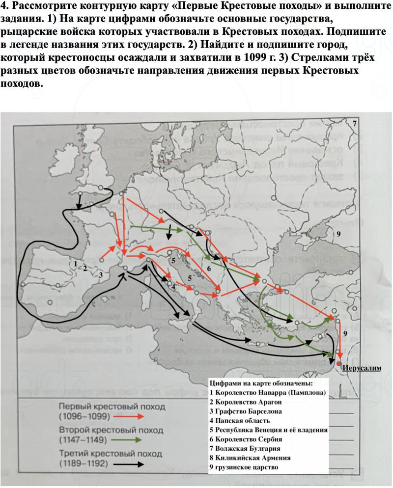4. Рассмотрите контурную карту «Первые Крестовые походы» и выполните задания. 1) На карте цифрами обозначьте основные государства, рыцарские войска которых участвовали в Крестовых походах. Подпишите в легенде названия этих государств. 2) Найдите и подпишите город, который крестоносцы осаждали и захватили в 1099 г. 3) Стрелками трёх разных цветов обозначьте направления движения первых Крестовых походов.