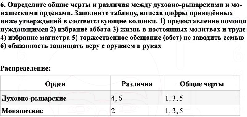 6. Определите общие черты и различия между духовно-рыцарскими и мо-нашескими орденами. Заполните таблицу, вписав цифры приведённых ниже утверждений в соответствующие колонки. 1) предоставление помощи нуждающимся 2) избрание аббата 3) жизнь в постоянных молитвах и труде 4) избрание магистра 5) торжественное обещание (обет) не заводить семью 6) обязанность защищать веру с оружием в руках