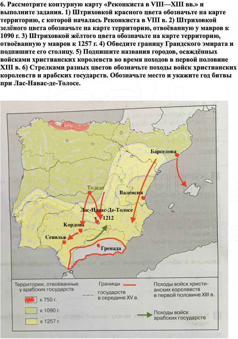 6. Рассмотрите контурную карту «Реконкиста в VIII—XIII вв.» и выполните задания. 1) Штриховкой красного цвета обозначьте на карте территорию, с которой началась Реконкиста в VIII в. 2) Штриховкой зелёного цвета обозначьте на карте территорию, отвоёванную у мавров к 1090 г. 3) Штриховкой жёлтого цвета обозначьте на карте территорию, отвоёванную у мавров к 1257 г. 4) Обведите границу Грандского эмирата и подпишите его столицу. 5) Подпишите названия городов, осаждённых войсками христианских королевств во время походов в первой половине XIII в. 6) Стрелками разных цветов обозначьте походы войск христианских королевств и арабских государств. Обозначьте место и укажите год битвы при Лас-Навас-де-Толосе.