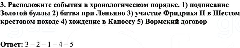 3. Расположите события в хронологическом порядке. 1) подписание Золотой буллы 2) битва при Леньяно 3) участие Фридриха II в Шестом крестовом походе 4) хождение в Каноссу 5) Вормский договор