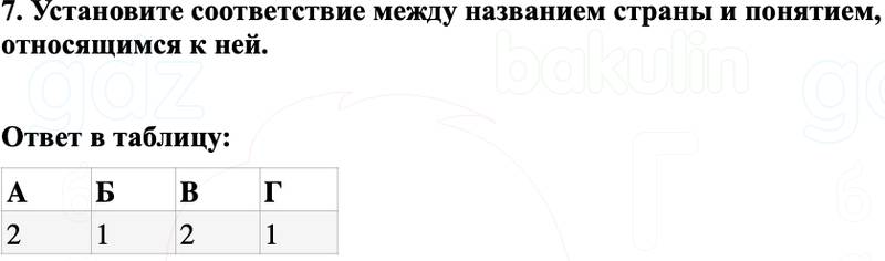 7. Установите соответствие между названием страны и понятием, относящимся к ней.
