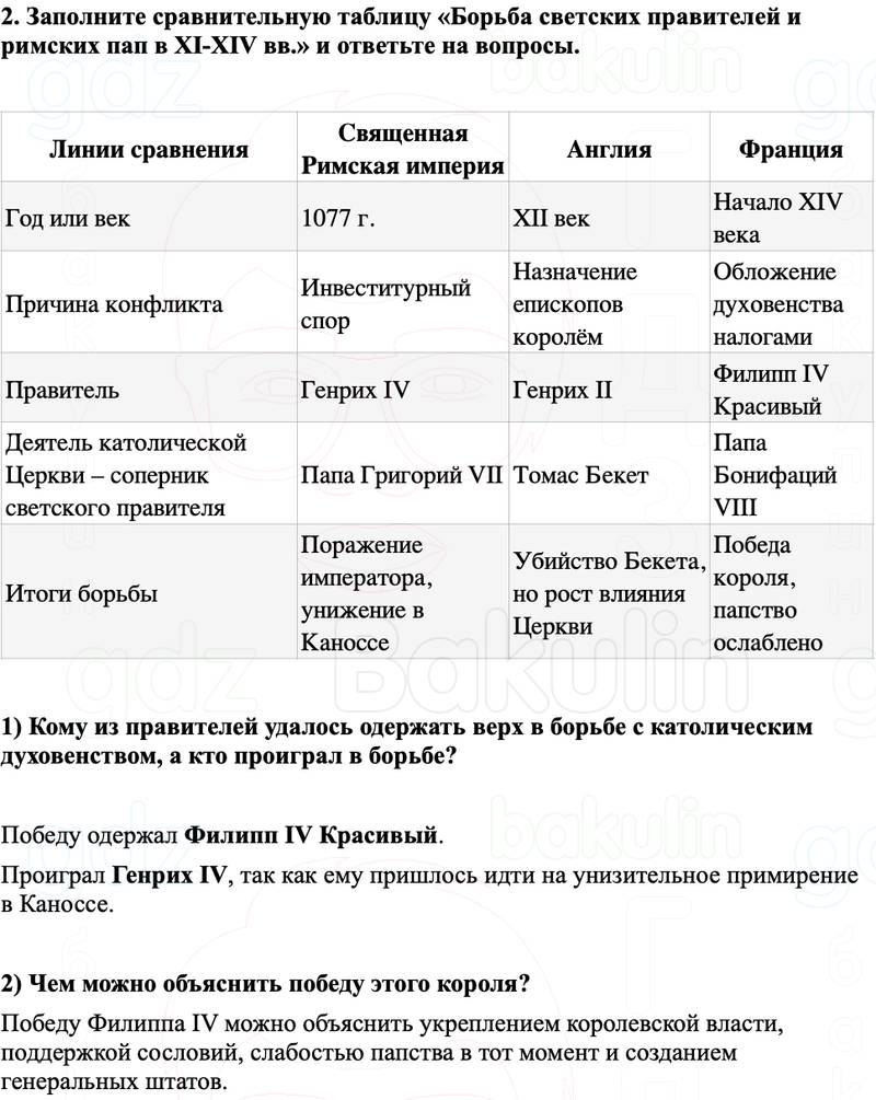 2. Заполните сравнительную таблицу «Борьба светских правителей и римских пап в XI-XIV вв.» и ответьте на вопросы.