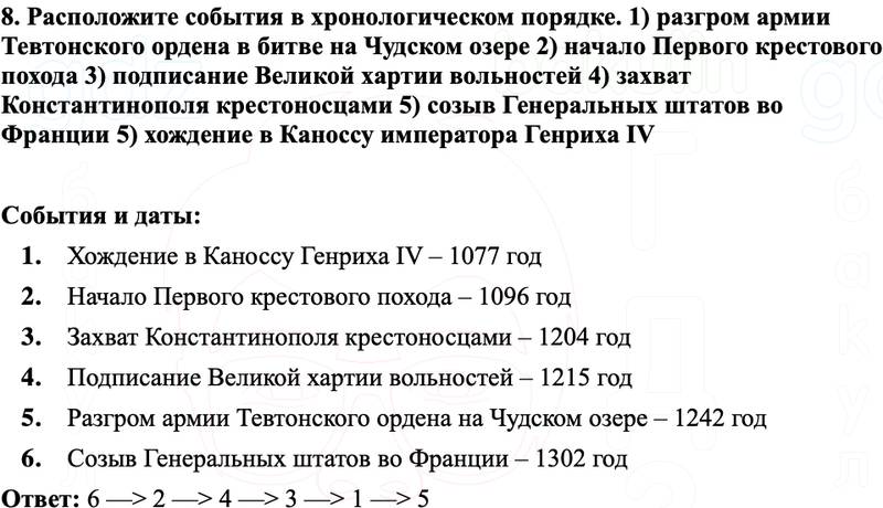 8. Расположите события в хронологическом порядке. 1) разгром армии Тевтонского ордена в битве на Чудском озере 2) начало Первого крестового похода 3) подписание Великой хартии вольностей 4) захват Константинополя крестоносцами 5) созыв Генеральных штатов во Франции 5) хождение в Каноссу императора Генриха IV