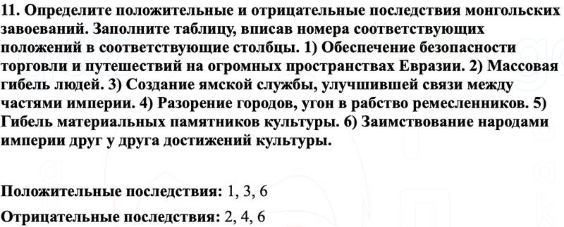 11. Определите положительные и отрицательные последствия монгольских завоеваний. Заполните таблицу, вписав номера соответствующих положений в соответствующие столбцы.