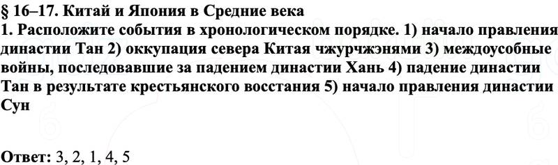 1. Расположите события в хронологическом порядке. 1) начало правления династии Тан 2) оккупация севера Китая чжурчжэнями 3) междоусобные войны, последовавшие за падением династии Хань 4) падение династии Тан в результате крестьянского восстания 5) начало правления династии Сун