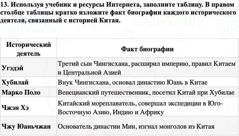 13. Используя учебник и ресурсы Интернета, заполните таблицу. В правом столбце таблицы кратко изложите факт биографии каждого исторического деятеля, связанный с историей Китая.