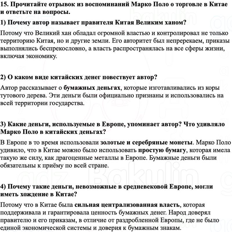15. Прочитайте отрывок из воспоминаний Марко Поло о торговле в Китае и ответьте на вопросы. 1) Почему автор называет правителя Китая Великим ханом? 2) О каком виде китайских денег повествует автор? 3) Какие деньги, используемые в Европе, упоминает автор? Что удивляло Марко Поло в китайских деньгах? 4) Почему такие деньги, невозможные в средневековой Европе, могли иметь хождение в Китае?